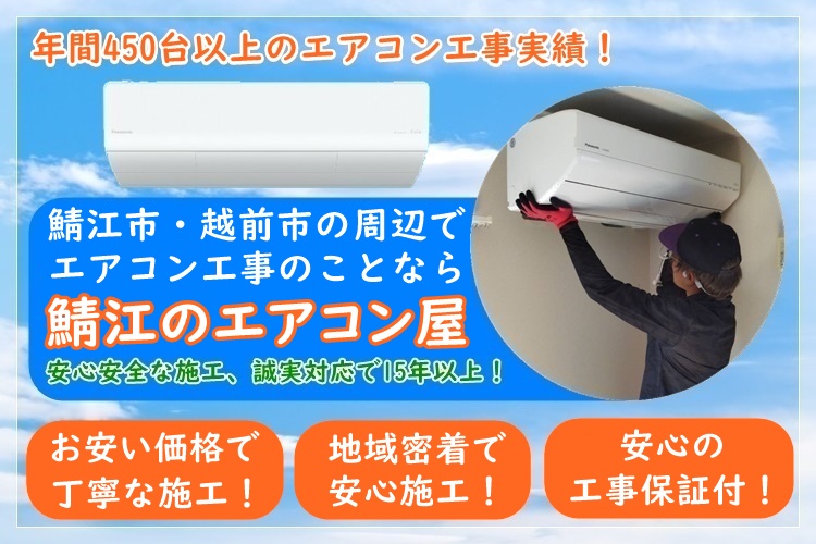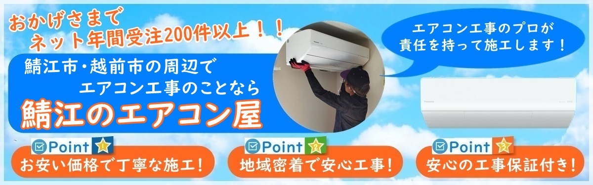 鯖江のエアコン屋は家庭用のエアコン工事を主にエアコン取り付け・取り外し工事をおこなっている地域密着のエアコン工事業者で、鯖江市を中心に福井県で活動しております。